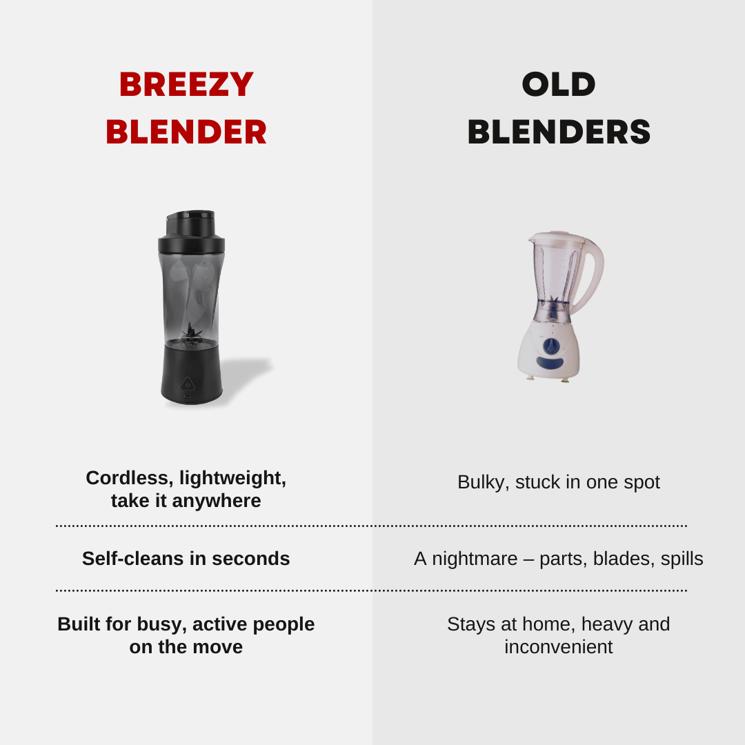 With Breezy Blender, you can whip up a fresh, healthy smoothie anywhere — in your car, at your desk, even at the gym. No kitchen, no mess, no excuses. Just real food, real fast.